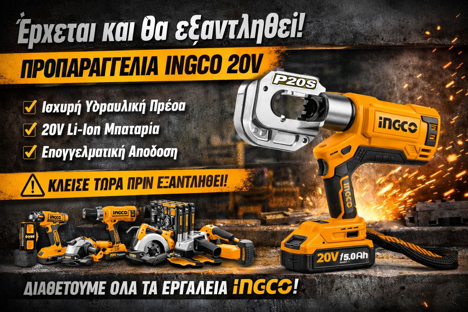 Η υδραυλική πρέσα καλωδίων INGCO 20V Li-Ion αναμένεται σύντομα και παρουσιάζει αυξημένη ζήτηση. Για τον λόγο αυτό, υπάρχει δυνατότητα προπαραγγελίας, ώστε να εξασφαλίσετε άμεσα τη διαθεσιμότητα του εργαλείου.